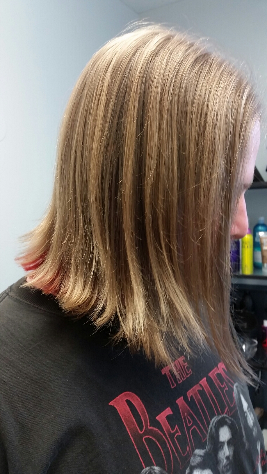 Jace wanted bright red, but he wanted it to be subtle and hidden. This is beautiful and vivid and he still gets the benefit of it not being like being hit in the head with a bat. This is a prime example of the color “yelling” but the cut whispering. I got a text later that he loved it!
