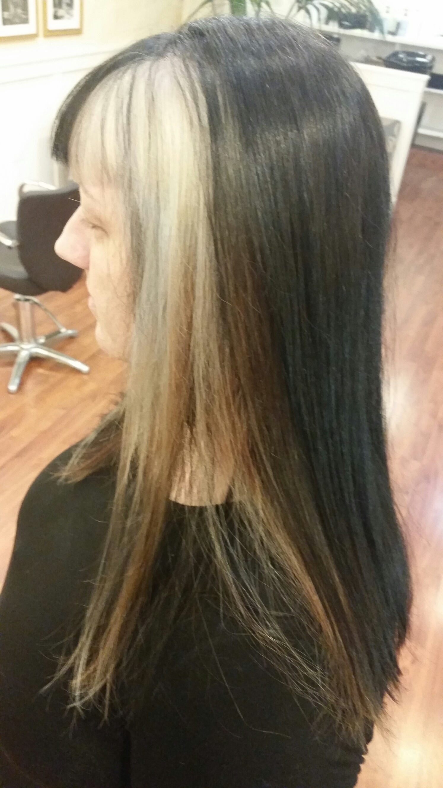 Here is a beautiful high contrast color. We are working from dyed black hair and and this is stage 1, and a half. She had gone to another stylist and not gotten exactly what she wanted so we discussed in detail what she was going for and what she may want to think about in the future when she is ready for a new color since this is a long term plan.